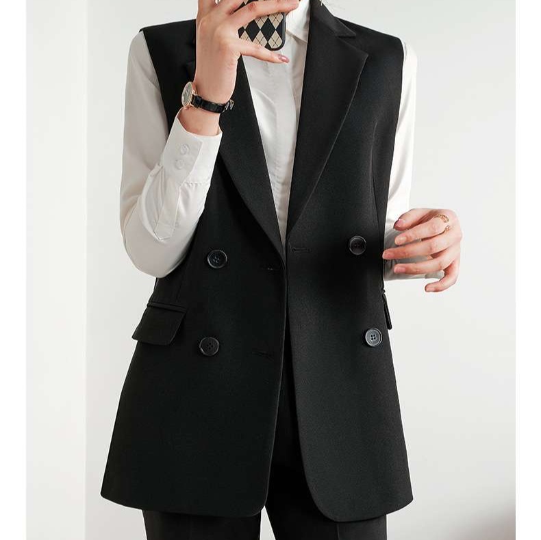 レディース向けダブルボタンテーラードジレは、クラシカルなダブルボタンデザインが魅力的なアイテムです。