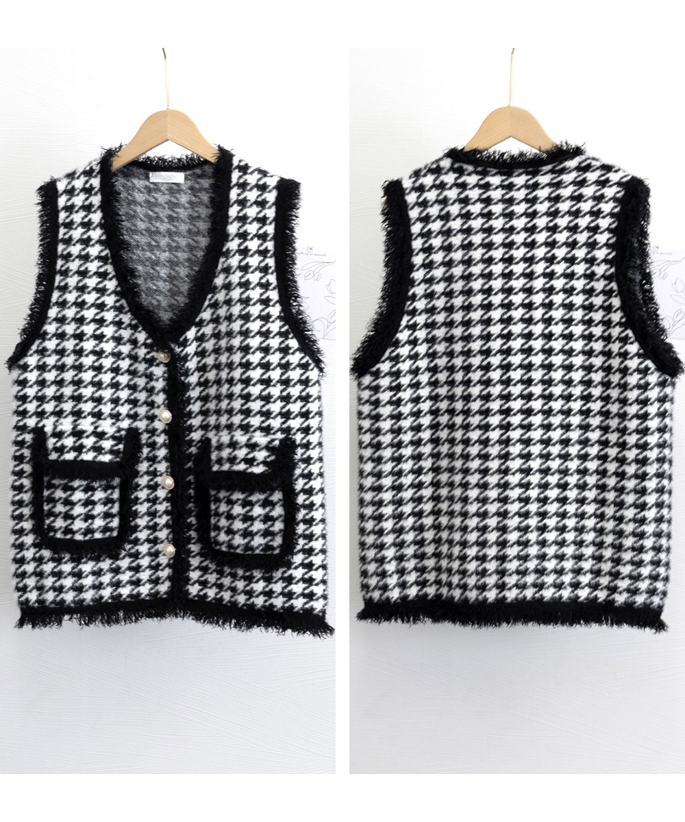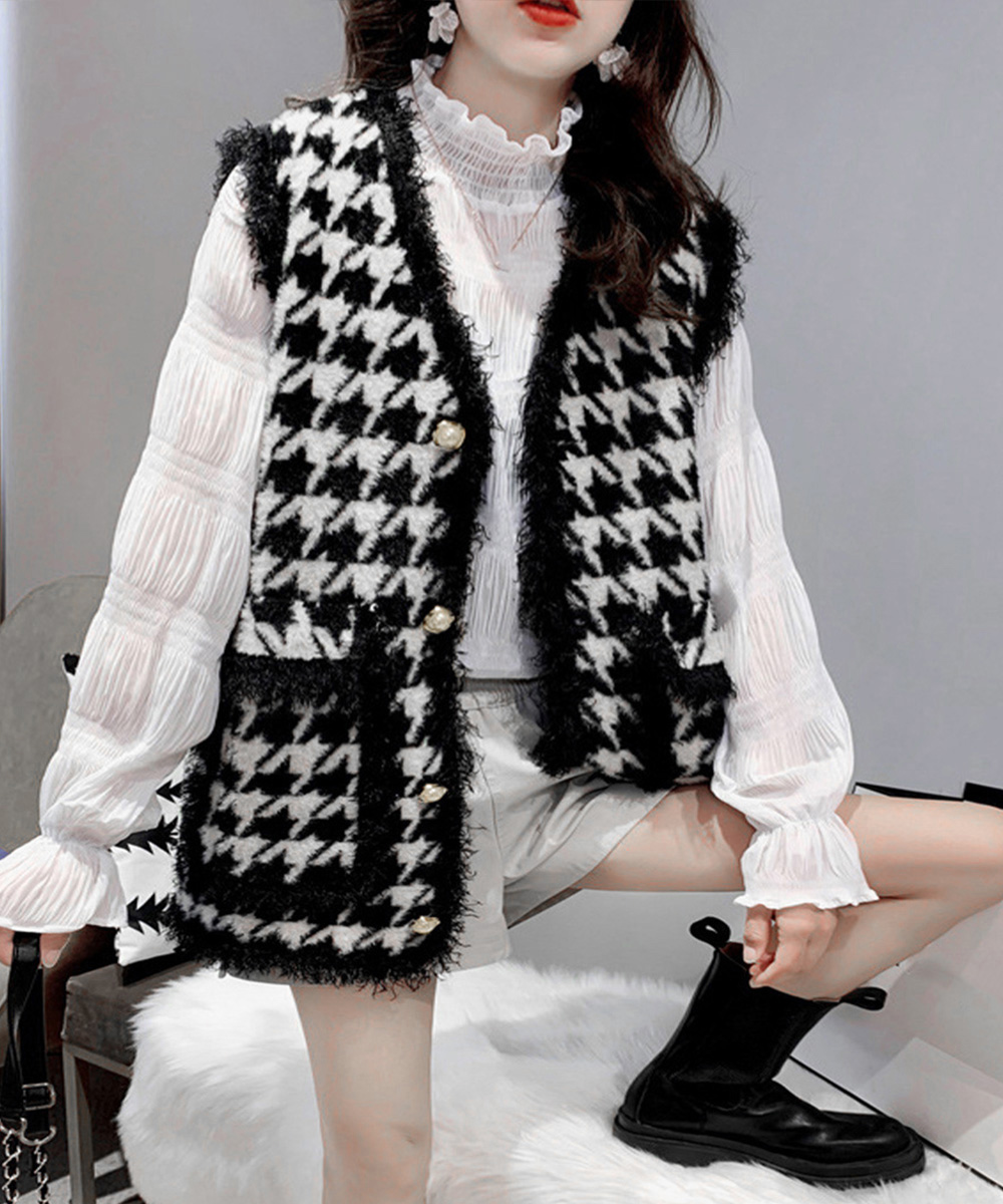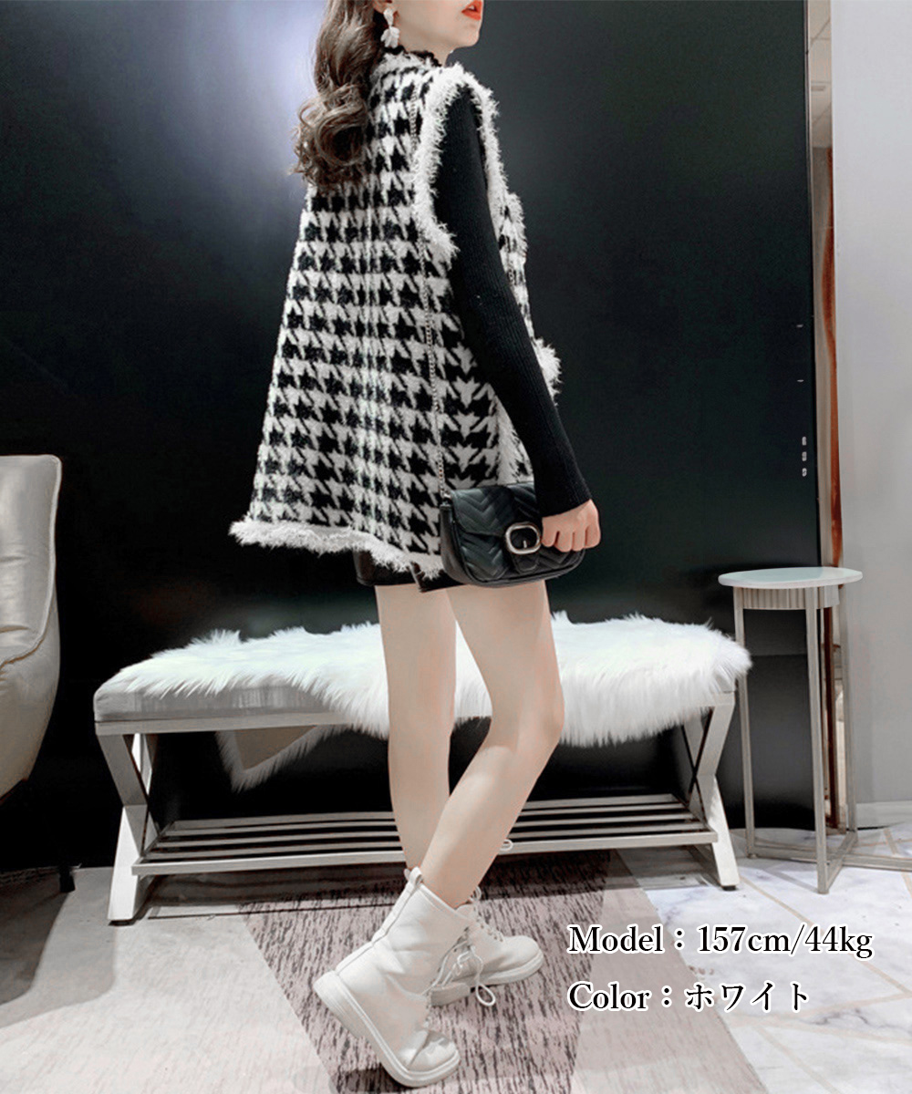 モノトーンの千鳥格子柄が大人っぽさと上品さを演出する、おしゃれなジレベスト。