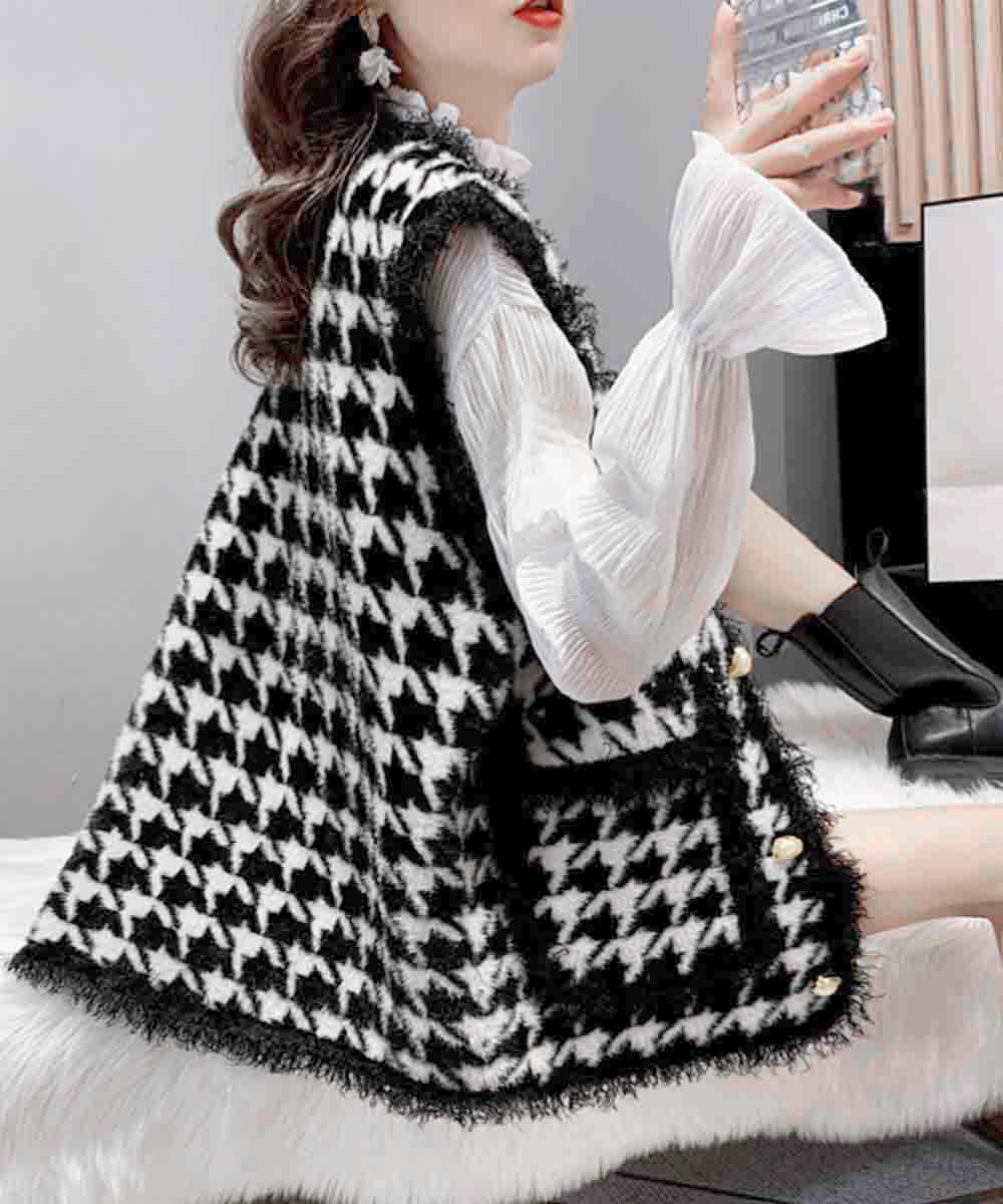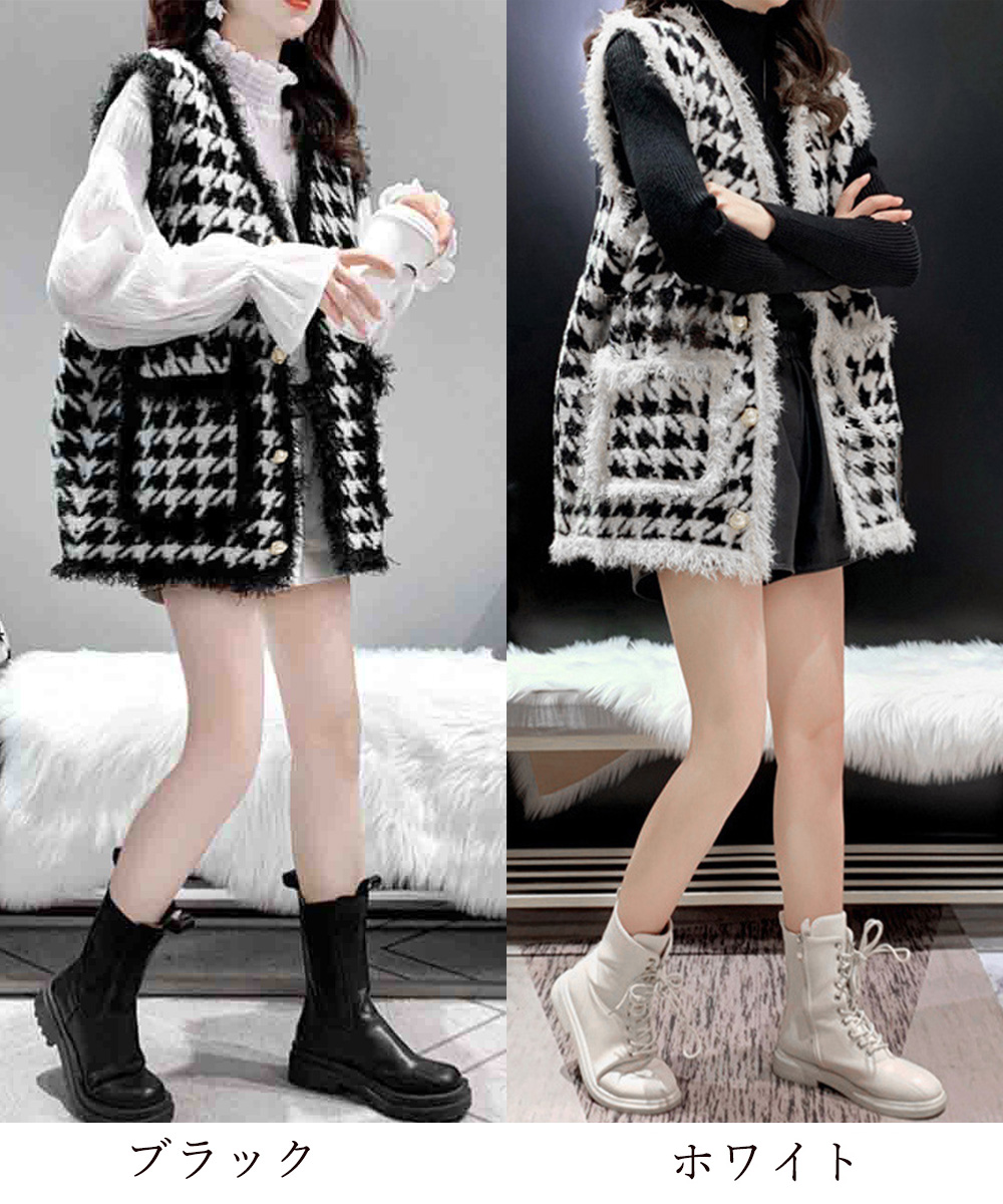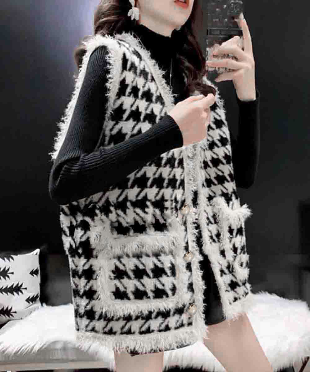 モノトーンの千鳥格子柄が大人っぽさと上品さを演出する、おしゃれなジレベスト。